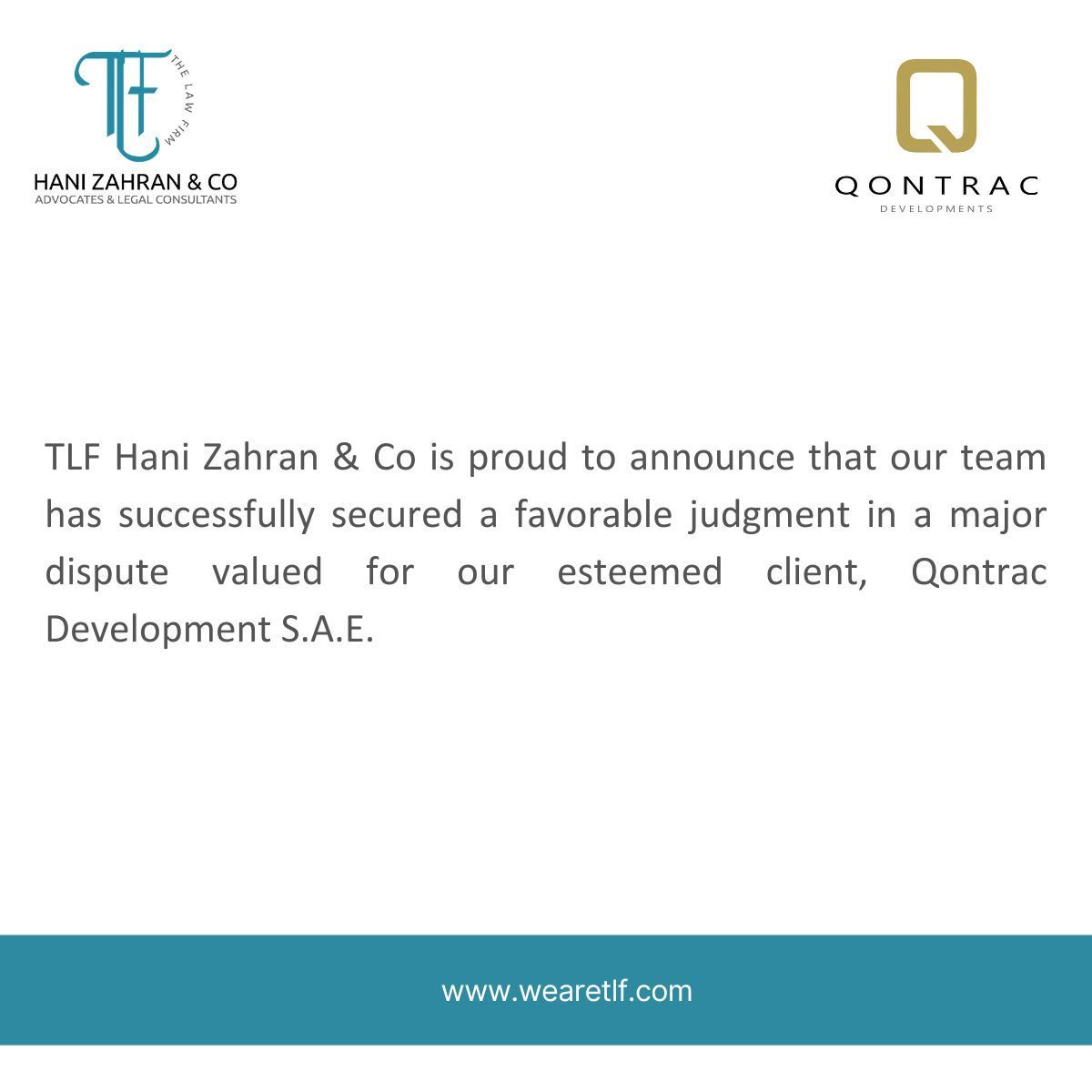 TLF Hani Zahran & Co is proud to announce that our team has successfully secured a favorable judgment in a major dispute on behalf of our esteemed client, Qontrac Developments S.A.E. The court has issued a decisive ruling in favor of Qontrac Developments in a high-value commercial dispute that has been ongoing for over three years, reaffirming their contractual rights and safeguarding their financial interests. This achievement was led by our Managing Partner, Mr. Hani Zahran, our Dispute Resolution Partner, Mr. Mohamed Roshdy, and our brilliant Associate Omar Hatem. This success underscores our firm’s unwavering commitment to delivering strategic, results-driven legal representation, reflecting years of rigorous legal work, meticulous preparation, and effective advocacy. We remain committed to protecting our clients’ interests and achieving exceptional results across all practice areas.