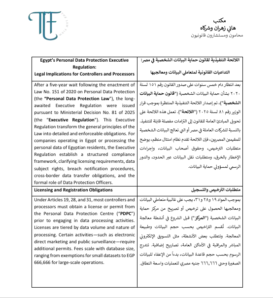 TLF Hani Zahran & Co is pleased to share a bilingual overview on Egypt’s Executive Regulation of the Personal Data Protection Law issued under Ministerial Decision No. 81 of 2025. After five years, this regulation turns broad legal principles into enforceable obligations, establishing a clear compliance framework for licensing, Data Protection Officers, breach reporting, and cross-border data transfers—shaping the way companies manage personal data in Egypt.