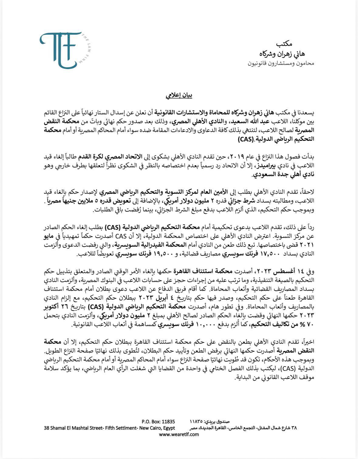 TLF Hani Zahran & Co Secures Final Ruling in Favor of Professional Footballer Abdallah El Saieed in Dispute with Al Ahly SC